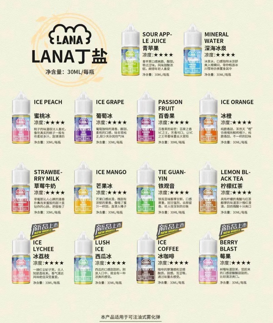 LANA 電子菸油以 “極冰口感” 和便捷性為核心賣點,通過陶瓷芯霧化技術和尼古丁鹽應用,為用戶提供高還原度的口味體驗。